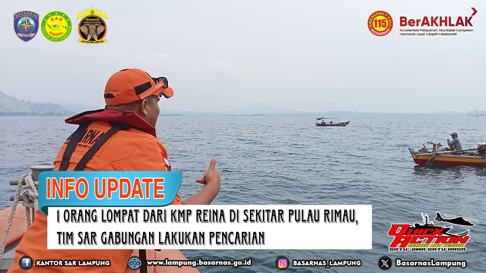 Lampung Selatan --- Pagi ini Tim SAR Gabungan melakukan pencarian terhadap penumpang KMP Reina tujuan Pelabuhan Bakauheni di Perairan Pulau Rimau Kec. Bakauheni Kab. Lampung Selatan pada Kamis (25/04).