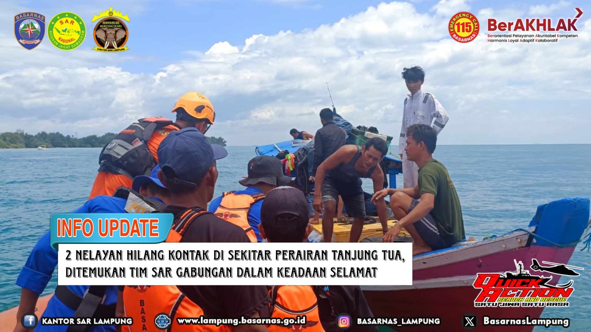 Lampung Selatan --- Tim SAR Gabungan berhasil temukan 2 orang nelayan yang hilang kontak di sekitar Perairan Tanjung Tua dan Pulau Sebesi Kab. Lampung Selatan pada Minggu (17/03/2024).