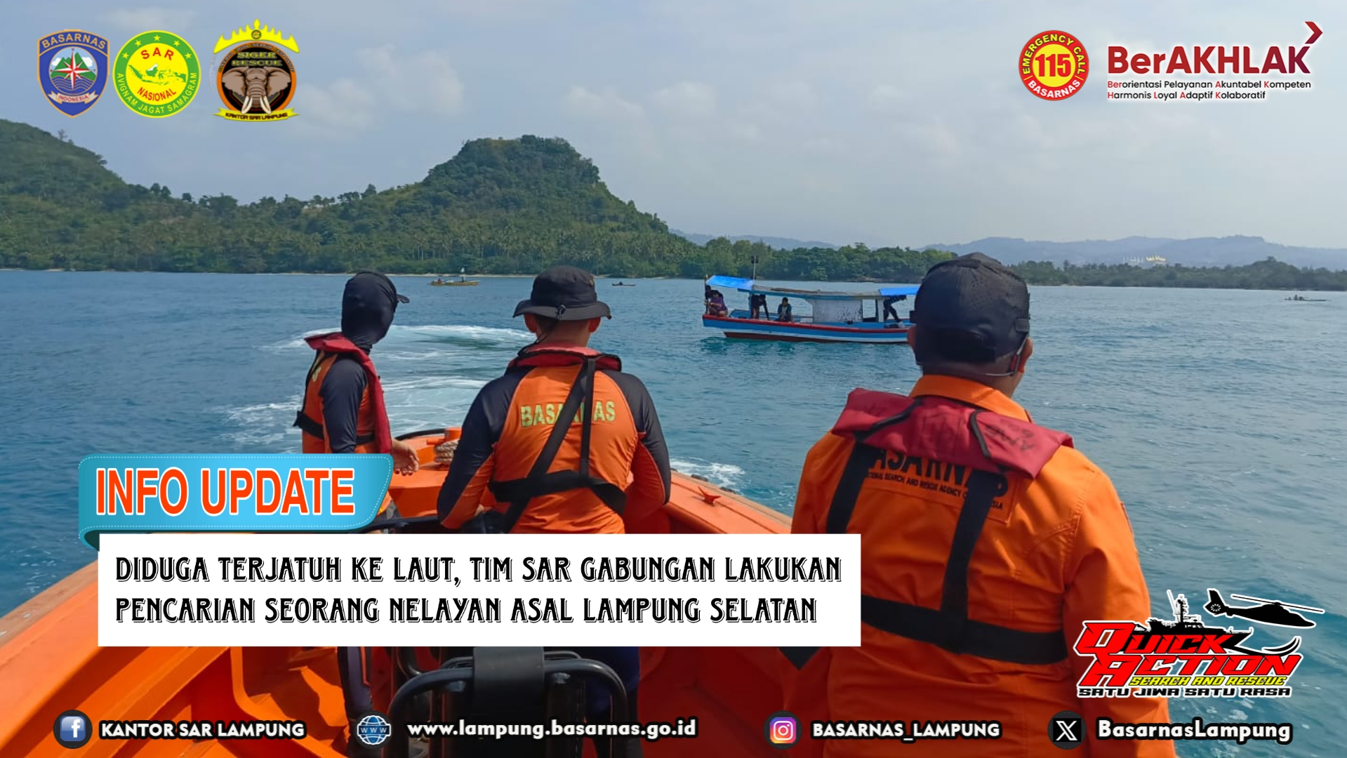 Menindaklanjuti informasi tersebut Kepala Kantor Pencarian dan Pertolongan Lampung Deden Ridwansah mengerahkan personil Pos SAR Bakauheni untuk melaksanakan pencarian terhadap nelayan tersebut. Tiba di lokasi kejadian tim langsung berkoordinasi dengan unsur SAR gabungan yang terdiri dari Polairud Polda Lampung, Polairud Polres Lampung Selatan, POS TNI AL Bakauheni, nelayan sekitar dan masyarakat setempat.