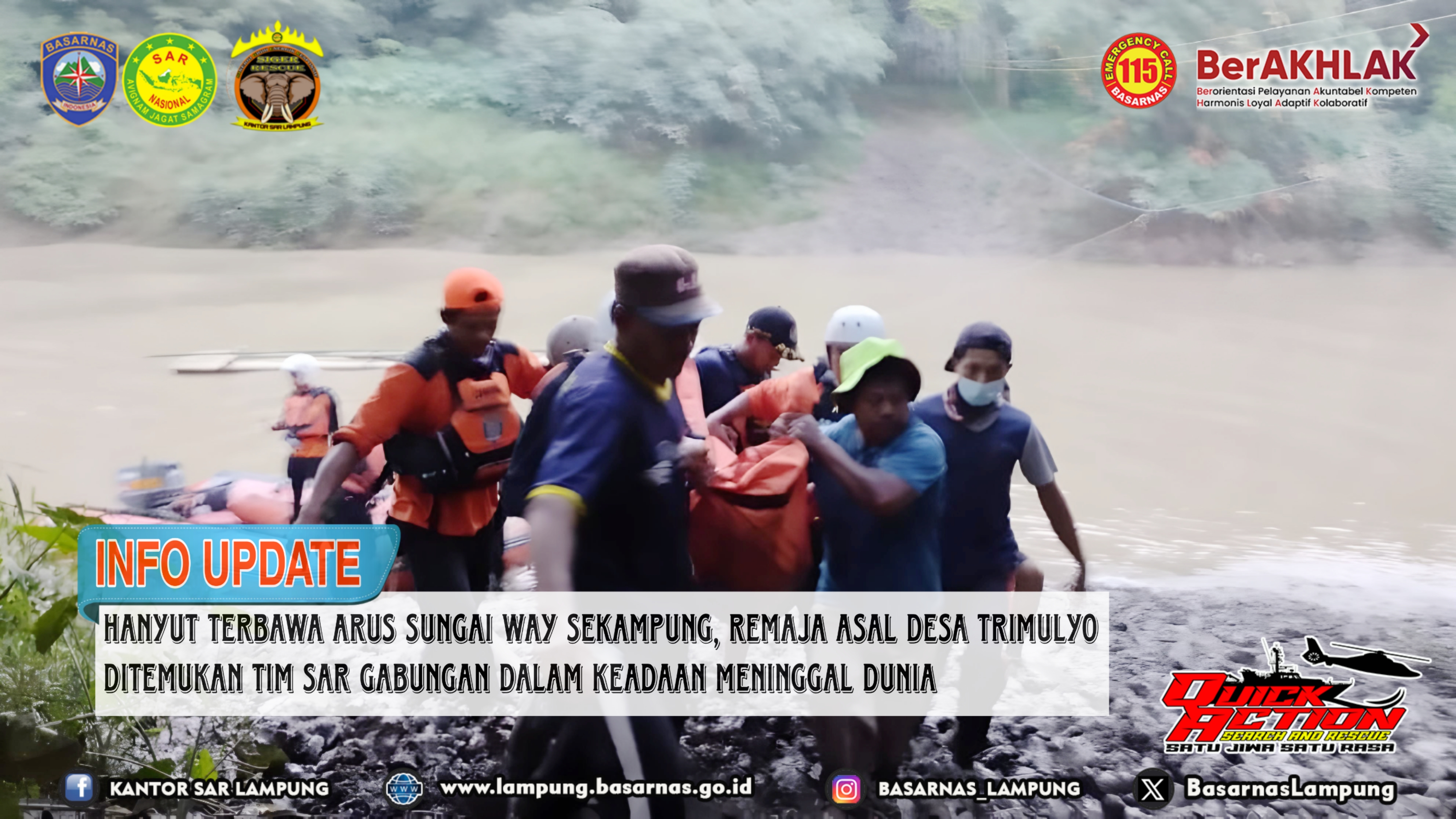 Hanyut Terbawa Arus Sungai Way Sekampung, Remaja Asal Desa Trimulyo Ditemukan Tim SAR Gabungan Dalam Keadaan Meninggal Dunia