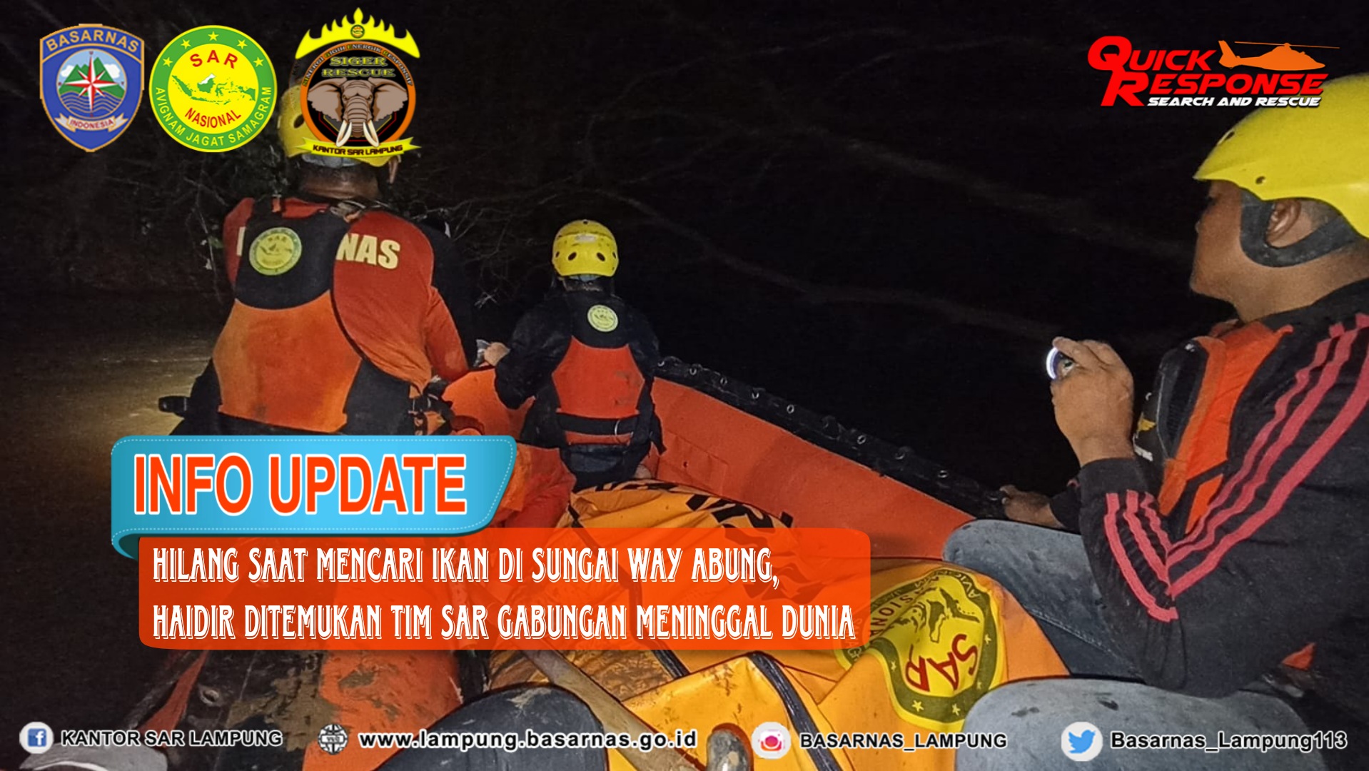 Kotabumi---Haidir (56), hilang saat mencari ikan di sungai Way Abung Kel. Kotabumi Udik Kec. Kotabumi Kab. Lampung Utara, ditemukan tim SAR Gabungan dalam keadaan meninggal dunia pada Senin (29/05/2023).