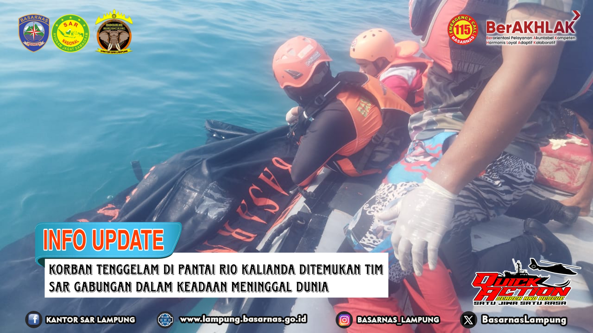 Komandan Pos SAR Bakauheni Rezie Kuswara melaporkan langsung info penemuan korban kepada Kepala Kantor SAR Lampung Deden Ridwansah selaku SMC (SAR Mission Coordinator). "Pada pukul 09.30 WIB korban a.n. Dika telah yang tenggelam di Pantai Rio ditemukan meninggal dunia. Selanjutnya korban dievakuasi menuju rumah duka.", ujar Rezie. (***)