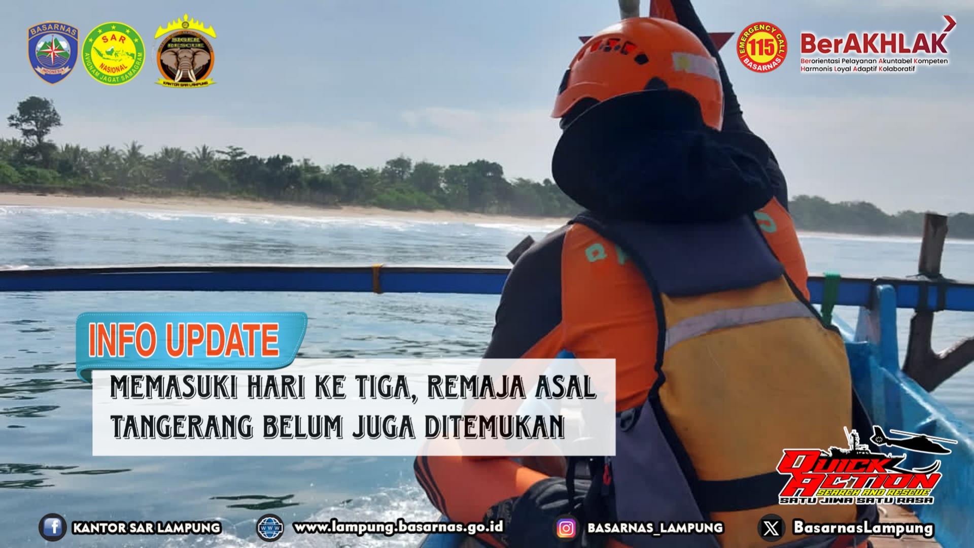 Pesisir Barat (02/04/2024) - Hingga pukul 17.40 WIB, pencarian hari ketiga terhadap seorang remaja yang terseret ombak saat bermain di Pantai Biha, Pesisir Barat masih nihil. Tim SAR Gabungan hari ini telah melakukan pencarian dengan melakukan penyisiran di berbagai titik dan membagi membagi tim menjadi 3 SRU sejak pukul 07.00 WIB.