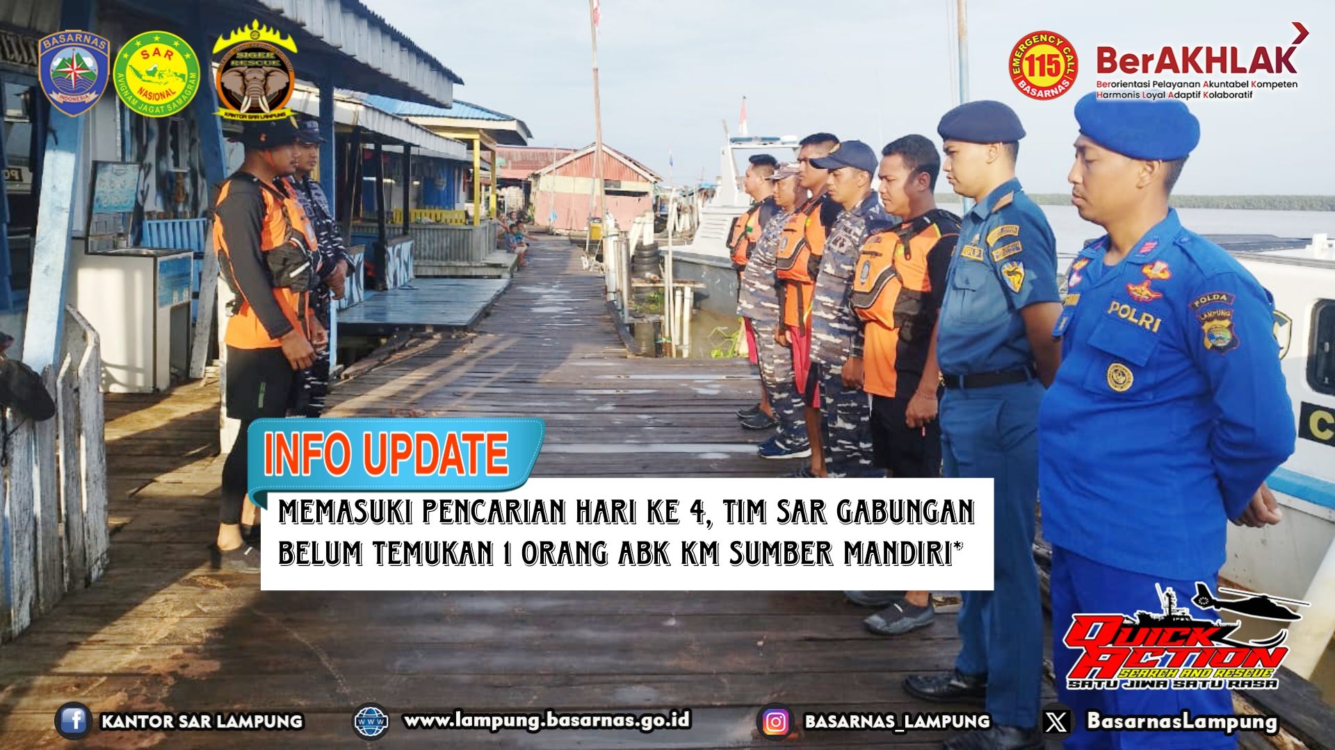 Hingga pukul 17.00 WIB pencarian hari ke 4 belum membuahkan hasil atau masih nihil. Hasil ini dilaporkan langsung oleh Komandan Tim Rescue Basarnas Lampung Koman Liyo kepada Kepala Kantor Basarnas Lampung Deden Ridwansah selaku SMC (SAR Mission Coordinator). "Pencarian hari ke 4 telah dilakukan hingga radius 11 Nautical Mile namun belum membuahkan hasil. Pencarian akan dilanjutkan kembali pada Rabu pagi sesuai rencana operasi hari ke 5.", kata Koman.(***)