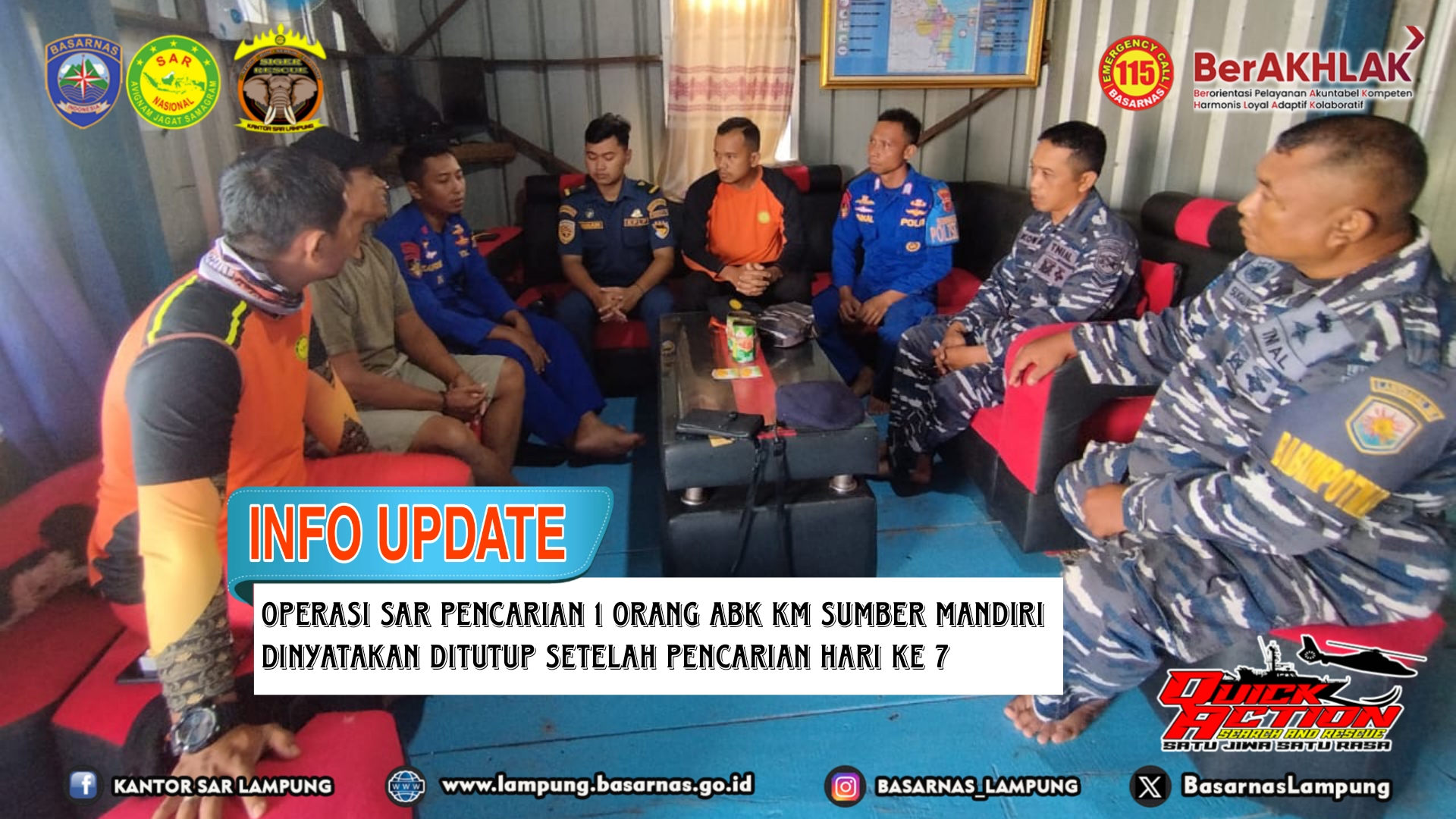 Apabila di kemudian hari terdapat laporan atau informasi tentang korban maka Operasi SAR siap dibuka kembali. Hal ini disampaikan oleh Kepala Seksi Operasi Didit Permana mewakili Kepala Kantor SAR Lampung Deden Ridwansah selaku SAR Mission Commander. "Operasi Pencarian terhadap ABK KM Sumber Mandiri yang terjatuh di Kuala Teladas dinyatakan ditutup pada hari ke 7. Apabila di kemudian hari terdapat informasi atau tanda-tanda korban, maka operasi SAR siap dibuka kembali.” tutup Didit. (***)