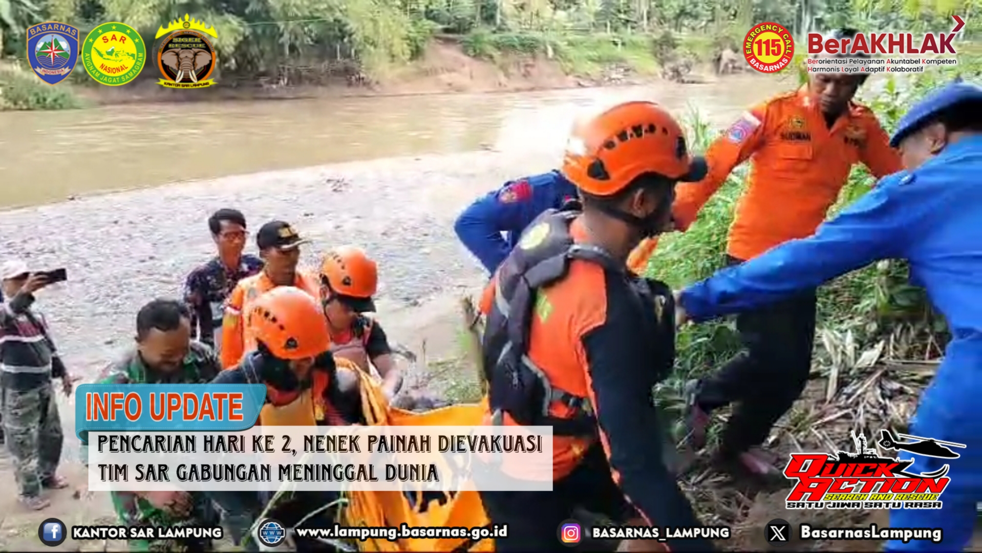 Koordinator Pos SAR Tanggamus Robi Rusli mewakili Kepala Kantor Basarnas Lampung Deden Ridwansah menyatakan bahwa korban dievakuasi menuju RSUD Batin Mangunang Kota Agung Tanggamus. "Korban a.n. Painah telah ditemukan Meninggal Dunia pada pukul 14.30 WIB sekitar 1 km dari lokasi kejadian. Selanjutnya korban dievakuasi menuju RSUD Batin Mangunang Kota Agung Tanggamus." Kata Robi. (***)