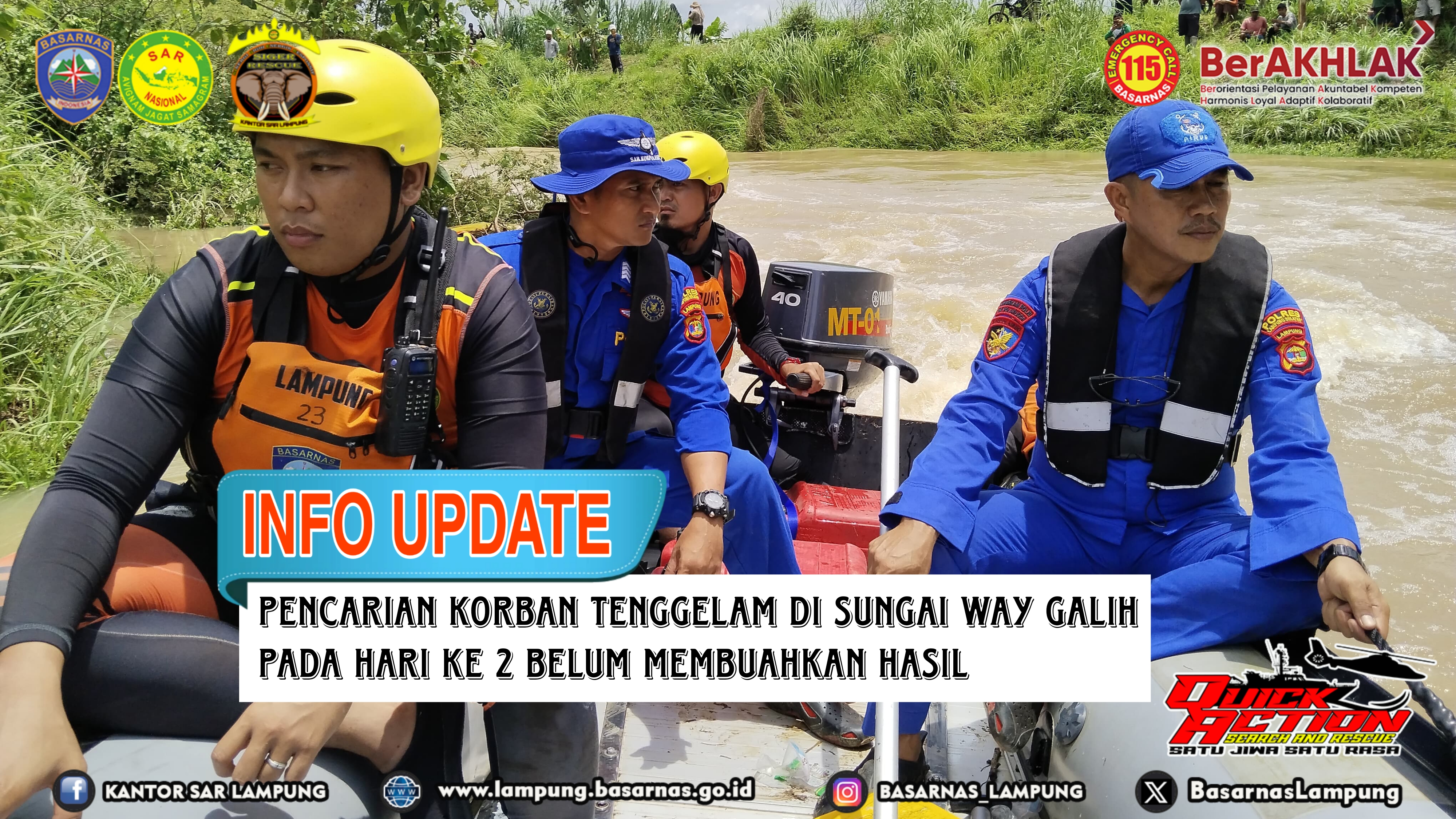 Lampung Selatan --- Pencarian Enggi (19), remaja yang tenggelam di Sungai Way Galih Kab. Lampung Selatan belum membuahkan hasil pada hari ke 2, Senin (04/03/2024).
