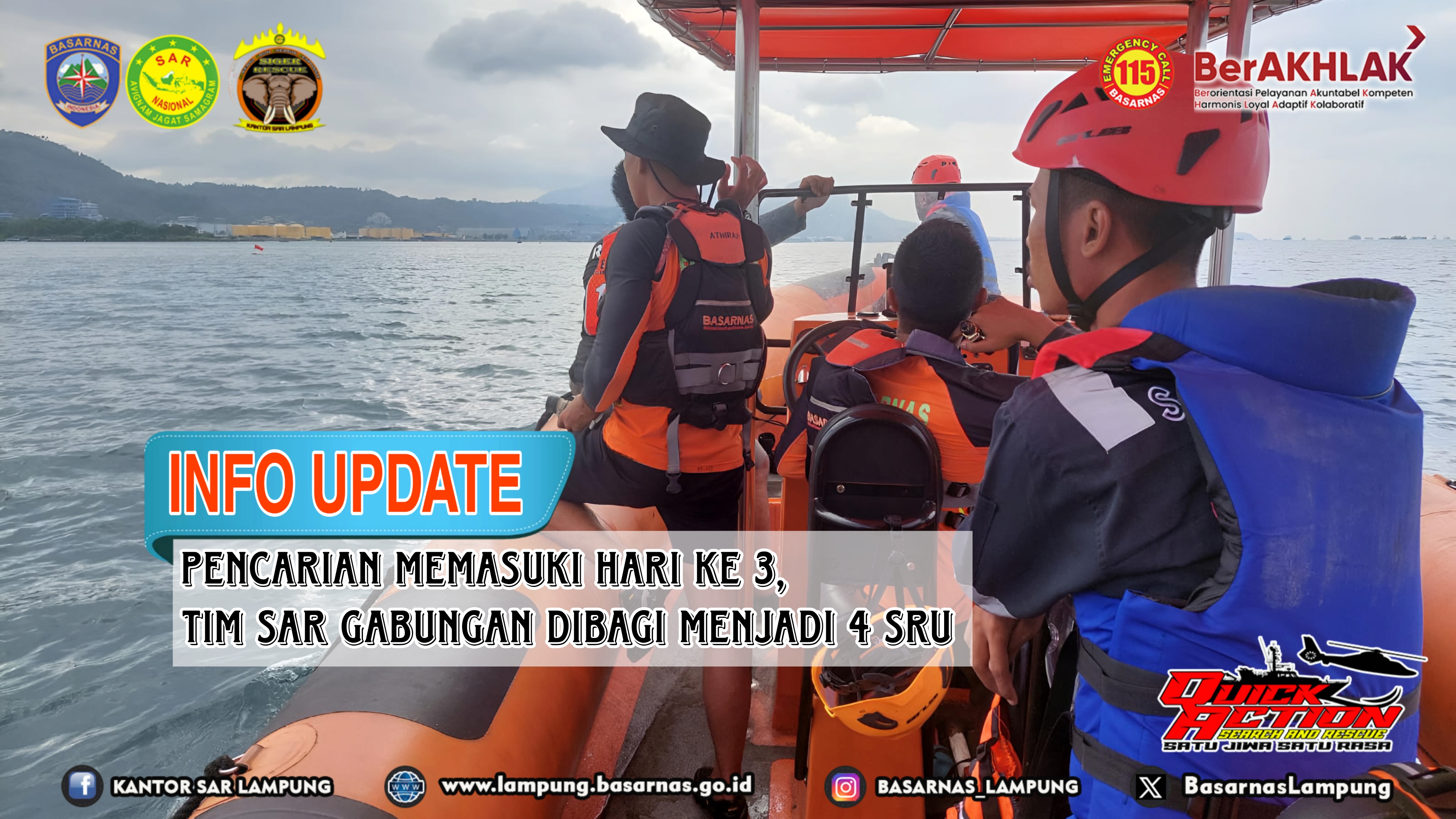 Bandar Lampung --- Tim SAR Gabungan membagi tim menjadi 4 SRU (SAR Rescue Unit) pada pencarian hari ke 3, Minggu (28/01/2024).