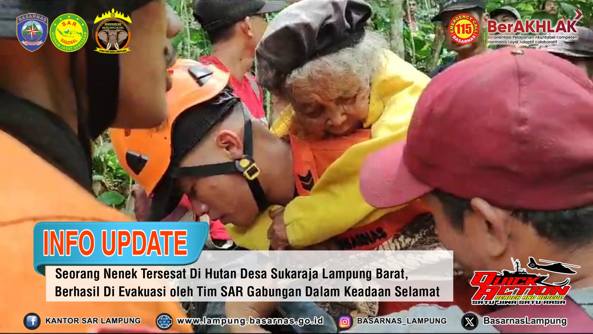 Lampung Barat --- Tim SAR Gabungan berhasil menemukan nenek yang tersesat saat berkebun di Hutan Desa Sukaraja Kec. Batu Brak Kab. Lampung Barat pada Kamis (04/01/2024).