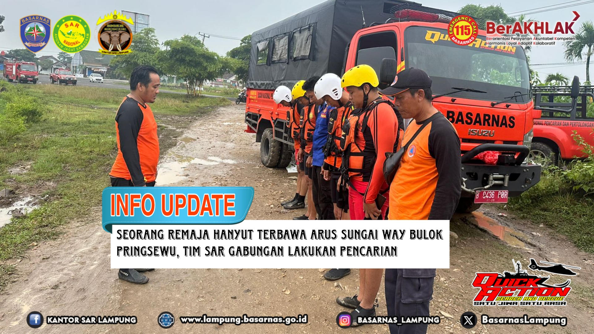 Kepala Kantor Basarnas Lampung Deden Ridwansah mengerahkan 1 tim rescue Kantor Basarnas Lampung untuk menuju lokasi dan melakukan pencarian. Pukul 21.23 WIB tim tiba di lokasi kejadian dan melakukan assessment dengan unsur SAR Gabungan yang terdiri dari Polsek Pringsewu, BPBD Pringsewu, Damkar Pringsewu, IEA (Indonesian Escord Ambulance) dan masyarakat sekitar.
