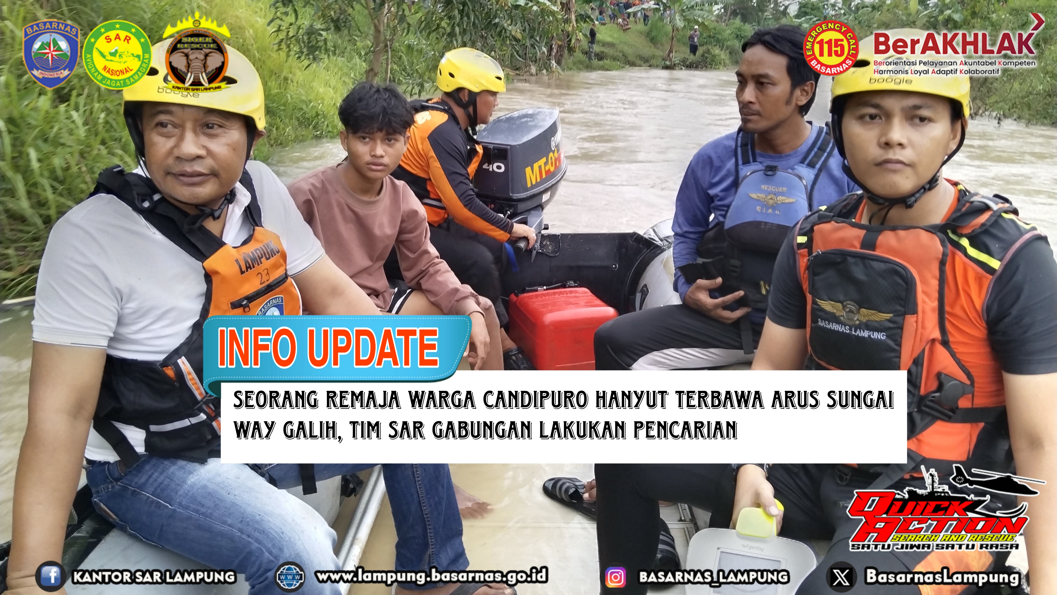 Lampung Selatan --- Tim SAR Gabungan lakukan pencarian terhadap Enggi (19) warga Candipuro yang hanyut terbawa arus sungai Way Galih Kab. Lampung Selatan pada Minggu (03/03/2024).