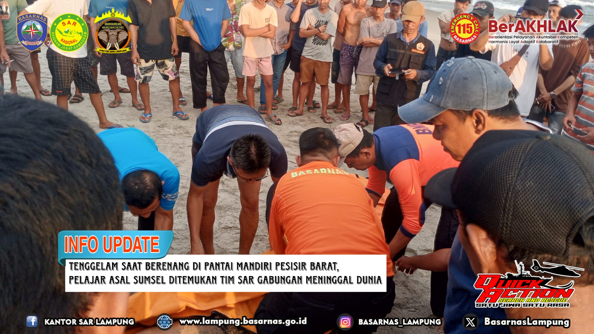 Pesisir Barat --- Tim SAR Gabungan temukan Syahrial Malino (17), pelajar SMKN 1 Belumbang Kec. Indralaya Kab. Ogan Ilir Sumatera Selatan tenggelam di Pantai Mandiri Sejati Kec. Krui Selatan Kab. Pesisir Barat dalam keadaan meninggal dunia pada Kamis (27/06/2024).