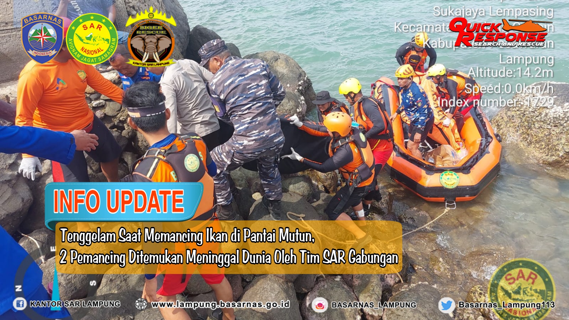 Pesawaran---Tim SAR Gabungan telah berhasil menemukan 2 Pemancing warga Kemiling Bandar Lampung dalam keadaan meninggal dunia pada Minggu (02/07/2023).