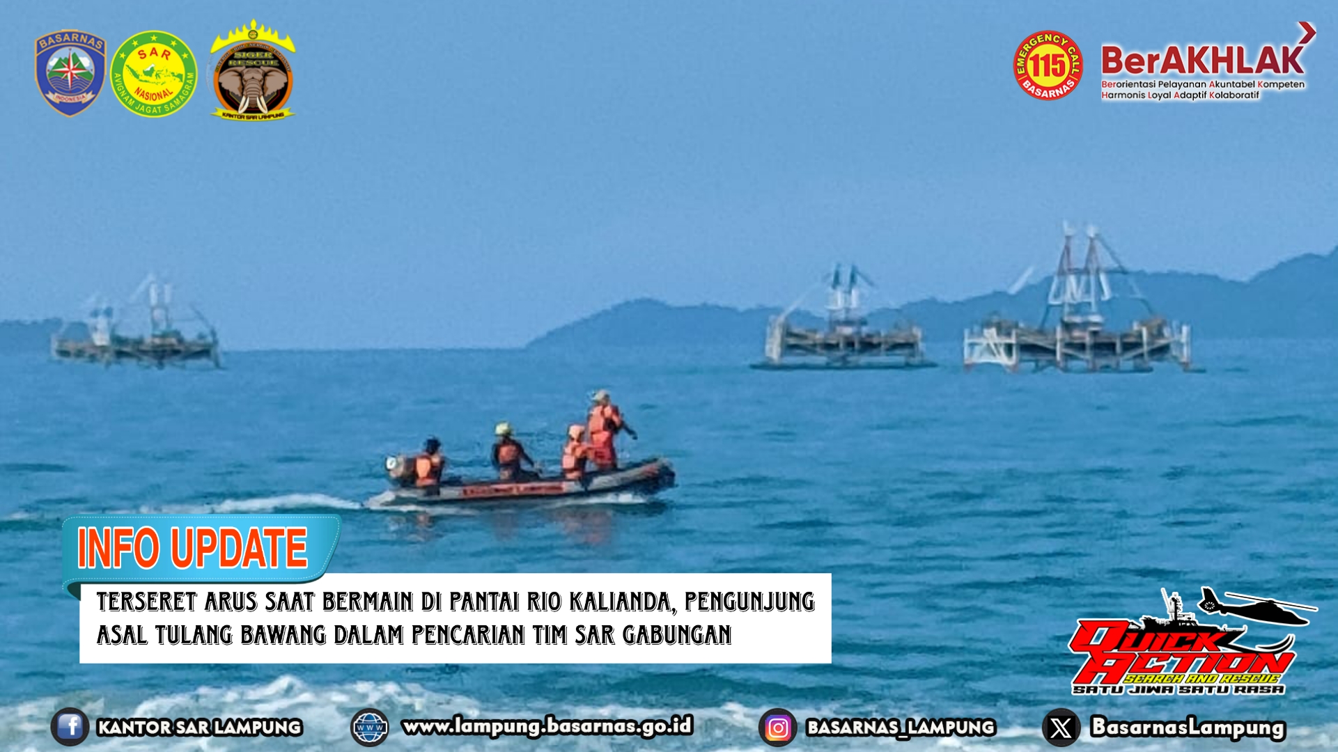 Kantor SAR Lampung mengerahkan 1 tim rescue Pos SAR Bakauheni untuk menuju lokasi kejadian dengan membawa peralatan pertolongan di air. Tiba di lokasi kejadian pada Sabtu (29/06) pukul 18.55 WIB tim langsung berkoordinasi dengan unsur SAR Gabungan yang terdiri dari personil Polres Lampung Selatan, Polairud Polres Lampung Selatan, Koramil Kalianda, BPBD Kab. Lampung Selatan, Dinas Pemadam Kebakaran dan Penyelamatan Kab. Lampung Selatan, Forum Rescue Relawan Lampung (FRRL), Pengelola Pantai Rio By The Baech dan masyarakat setempat.