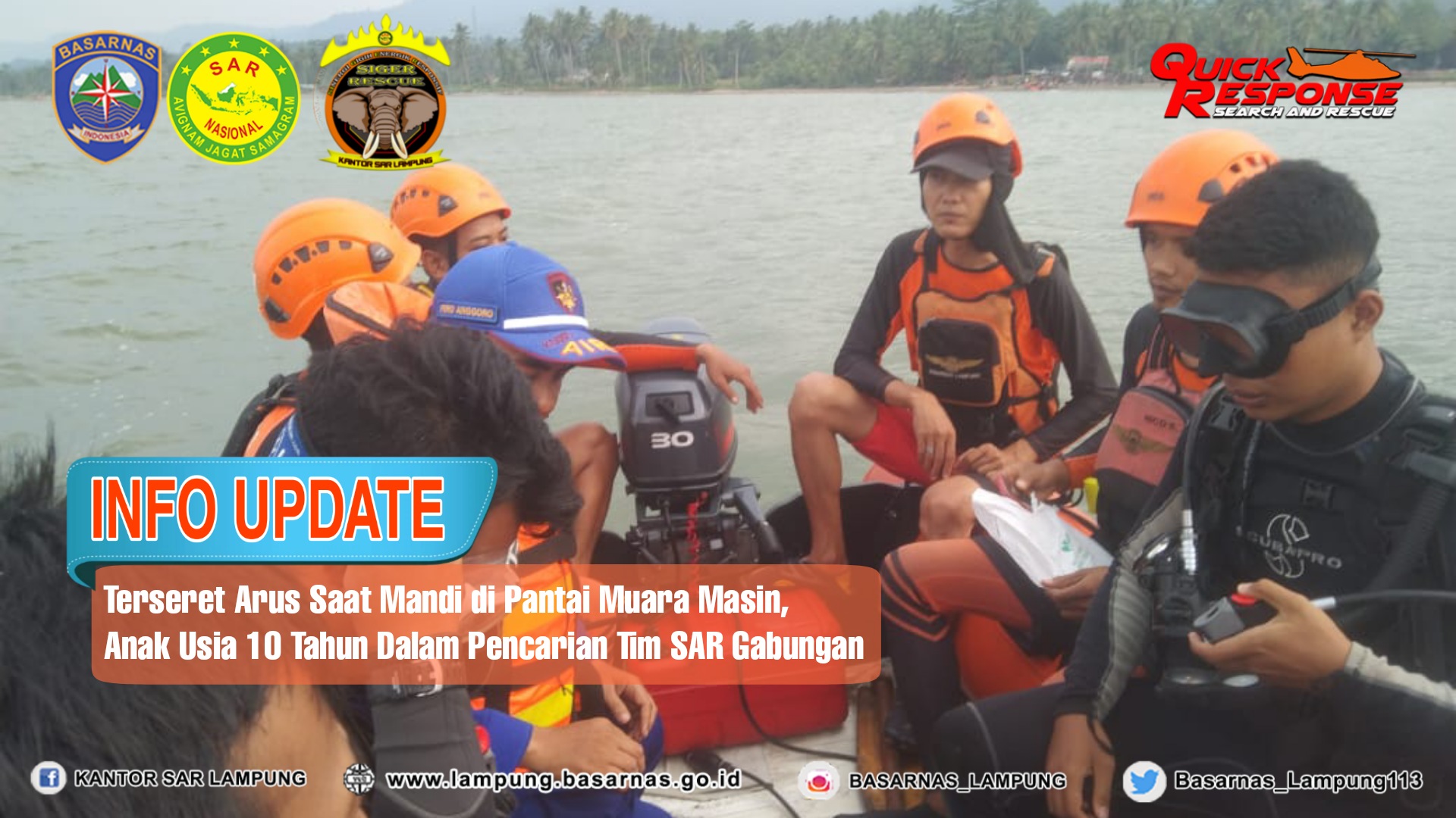 Tim Rescue Pos SAR Tanggamus tiba di lokasi pada Minggu (30/7) sekitar pukul 13.50 WIB dan langsung berkoordinasi dengan unsur SAR Gabungan yang terdiri dari Pos AL Tanggamus, Polair Polres Tanggamus, Damkar Tanggamus, BPBD Tanggamus, RAPI Tanggamus, Babinsa dan nelayan setempat.