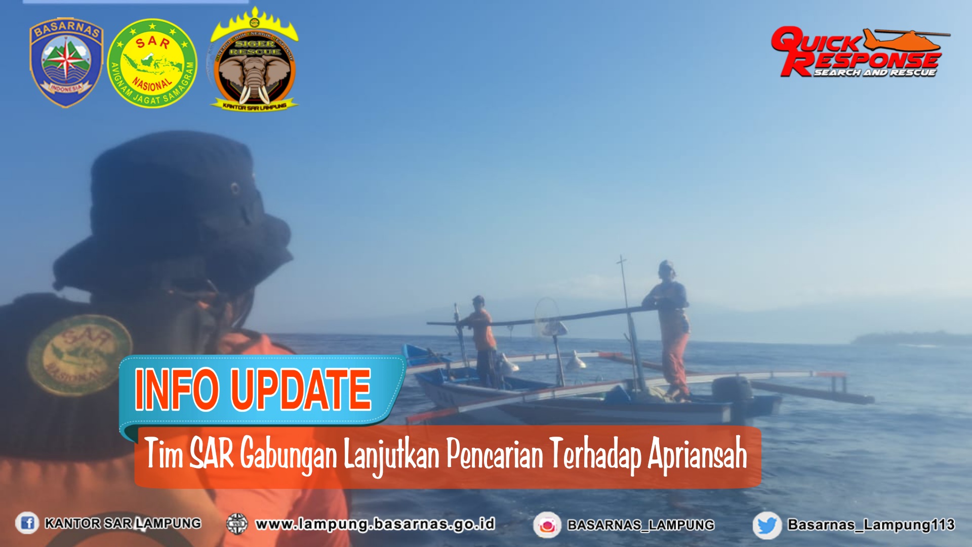 Koordinator Pos SAR Tanggamus Hendra Wahyu mewakili Kepala Kantor Basarnas Lampung Deden Ridwansah menyatakan bahwa upaya pencarian hari kedua ini dilaksanakan hingga pukul 17.30 WIB. "Pencarian kita hentikan sementara pukul 17.30 WIB dikarenakan kondisi cuaca yang kurang mendukung. Hasil Operasi SAR sementara masih nihil, pencarian akan dilanjutkan Selasa pagi." Ujar Hendra. (***)