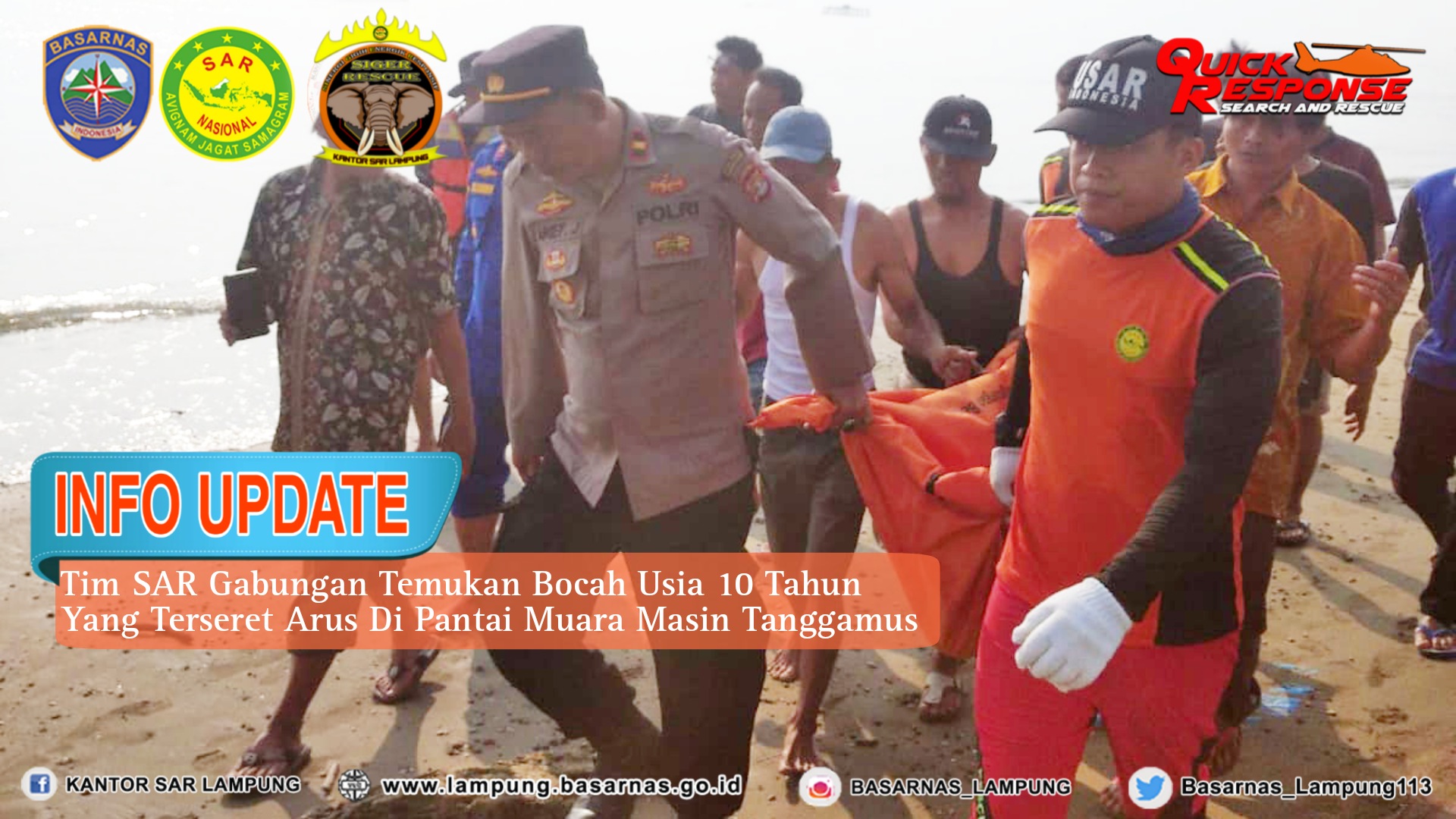 Tim SAR Gabungan Temukan Bocah Usia 10 Tahun Yang Terseret Arus Di Pantai Muara Masin Tanggamus