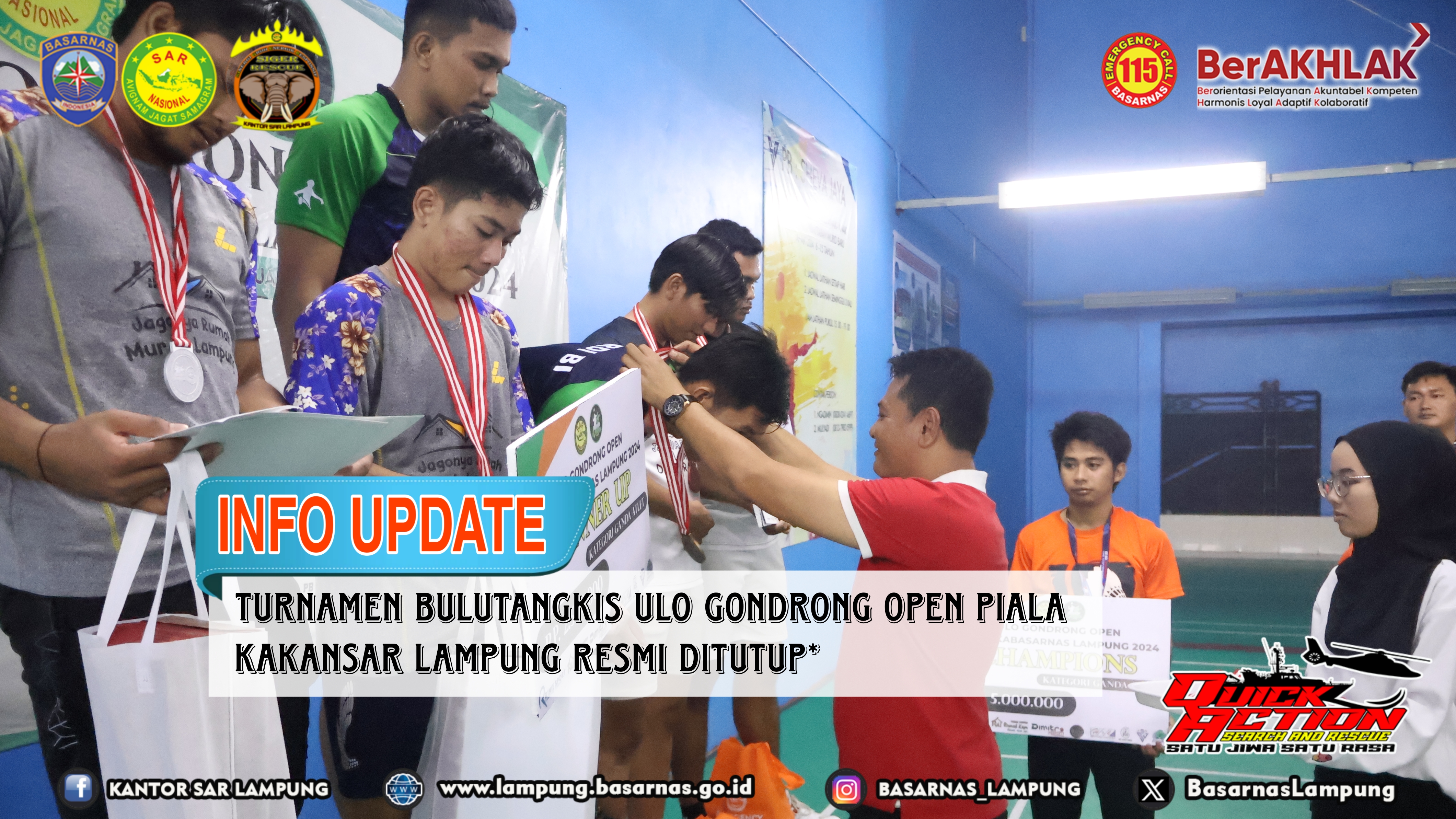 Bandar Lampung --- Turnamen Bulutangkis Ulo Gondrong Open Piala Kakansar Lampung 2024 yang berlangsung sejak tanggal 15 Februari lalu, hari ini berakhir dan ditutup oleh Kakansar Lampung Deden Ridwansah, S.Sos., Minggu (18/02/2024).