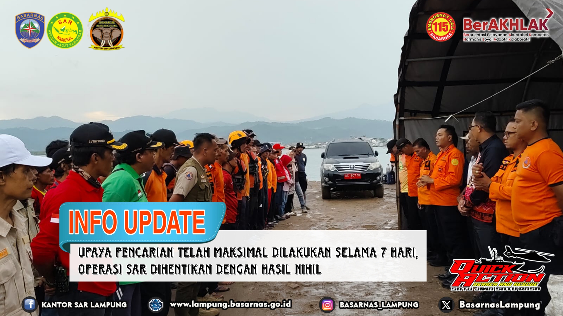 Bandar Lampung --- Tim SAR gabungan yang terdiri dari Tim Rescue Basarnas Lampung, Polair Polda Lampung, BPBD Bandar Lampung, Damkar Bandar Lampung, Puskesmas Sukaraja, Forum Rescue Relawan Lampung (FRRL), PMI, IEA, Mapala Unila, Babinsa Bumi Waras, Senkom Mitra Polri, Destana, RAPI, Al Fatah Rescue, Keluarga dan masyarakat setempat akhirnya menghentikan operasi pencarian terhadap Alfian (6) pada Kamis (01/02/2024).