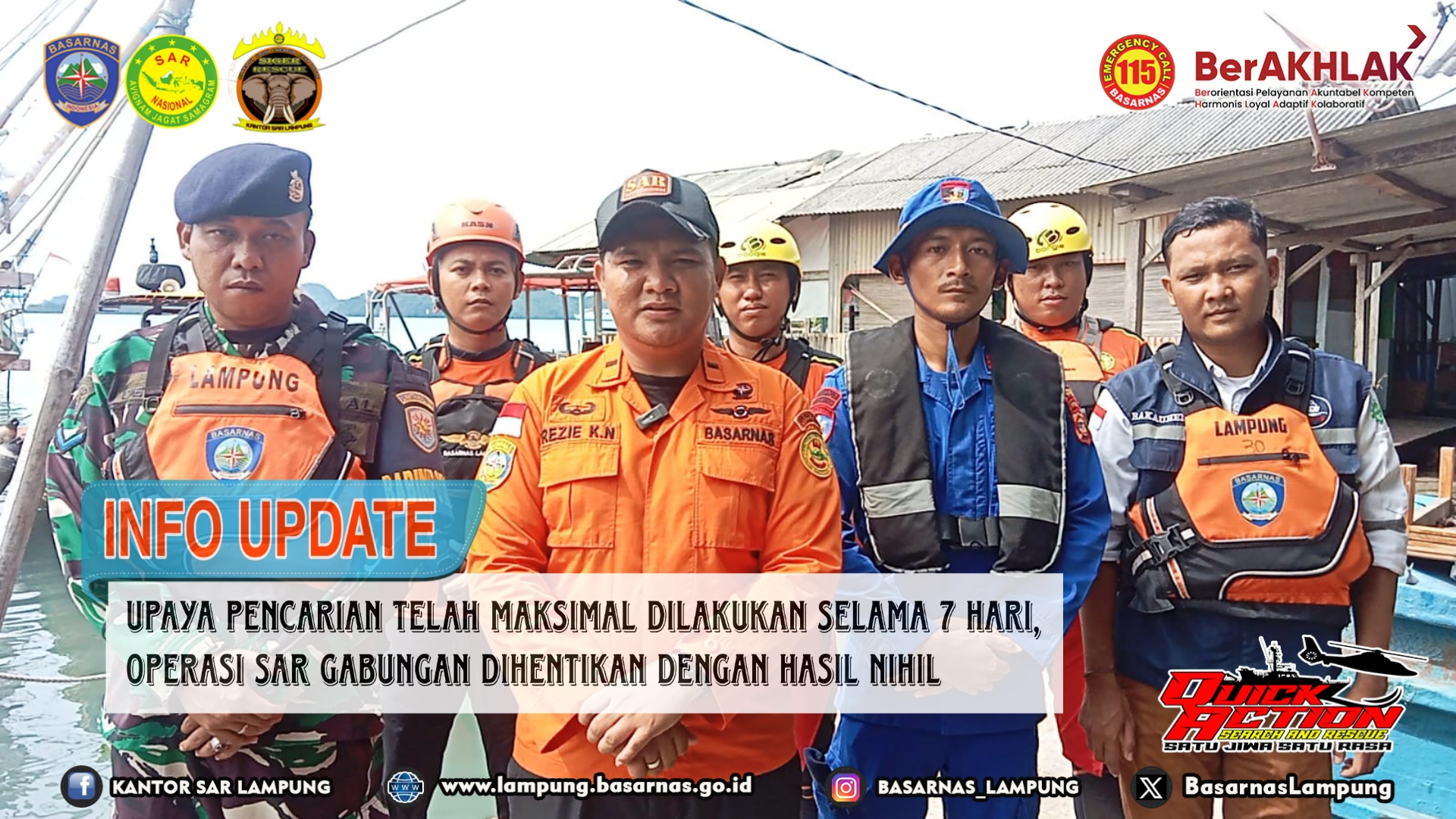 Komandan Pos SAR Bakauheni Rezie Kuswara mewakili Kepala Kantor Basarnas Lampung Deden Ridwansah, S.Sos. menyatakan bahwa pada hari ke 7 tim SAR Gabungan dibagi menjadi 3 SRU. Luas area pencarian hingga di sekitar perairan Pulau Sebuku.